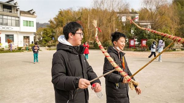 孩子们将一束束稻草捆扎在龙脊绳上。不一会儿,一条栩栩如生的草龙便初具雏形!干枯稻秆在指间翻飞成虬结龙身。举起这条金光闪闪的草龙,舞去旧岁晦气,舞来新年兴旺。
