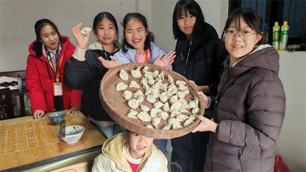 做客农户家「快进屋,火桶煨好了,先吃茶!」主人家的热情招呼声从院落里传来。案板上,已备好年夜饭的重头戏——包袱饺的馅料。大家洗净手,和主人家一起包包袱饺。这是徽州人过年必吃的美食,因其形似古时商人外出所背的包袱而得名。表达着对新一年行囊丰满、衣食无忧的美好祈愿!
