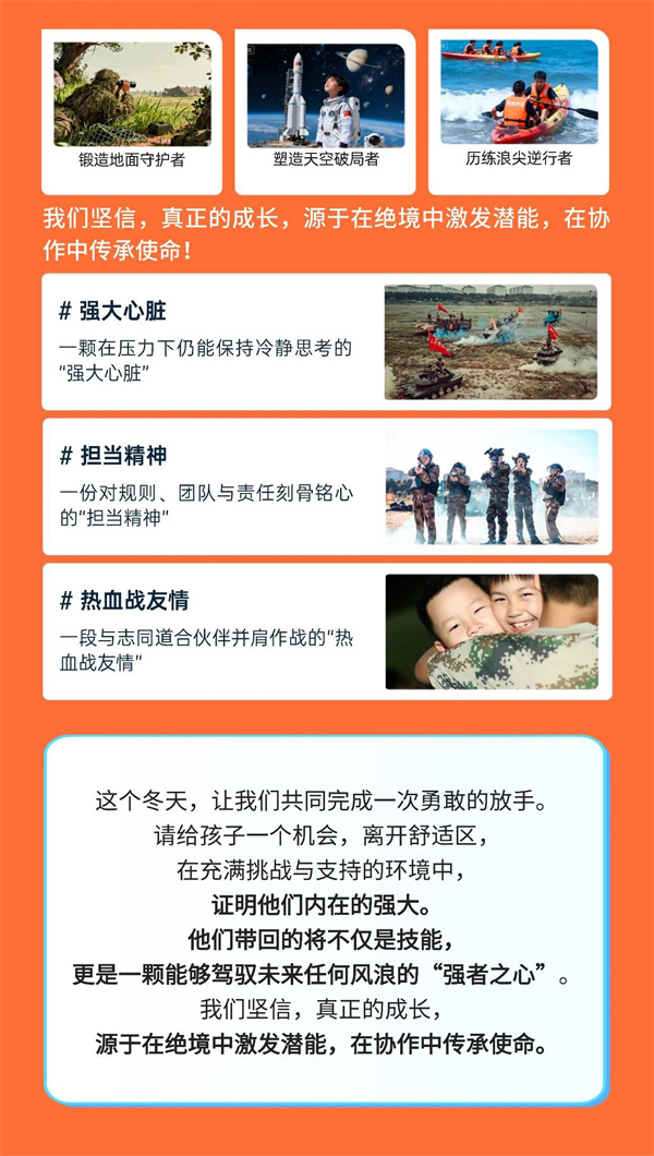 军事化行为引导:以军事思想塑造行为,养成良好习惯,塑造坚毅性格。爱国主义思想安全课,培养孩子爱国爱党情怀。