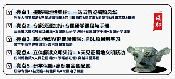 注:三星堆博物馆于节假日期间观展人流量将到达峰值,导致门票一票难求,为确保您的出行体验,我们会调动全体员工全力抢票,但如果未能抢票成功,行程中涉及到的【三星堆博物馆】将会根据实际情况同级替换为【金沙遗址博物馆】并安排大咖讲解