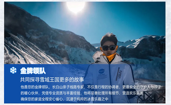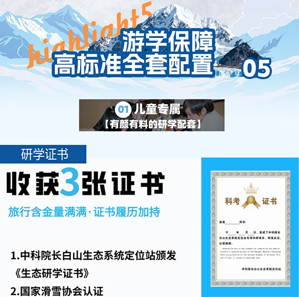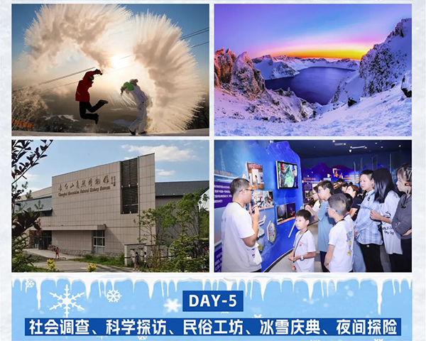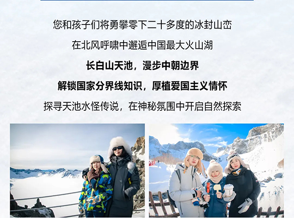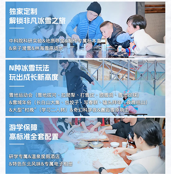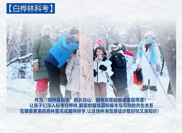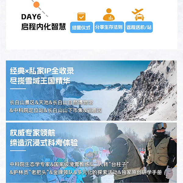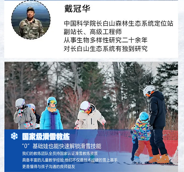 6. 服务:游学期间的司机、全程一名资深领队(0自费0购物)、全程一名专业摄影师(含照片直播)、滑雪教练费(1:4)、长白山自然博物馆讲解员一位、中科院专家一位、二人转演员两位、各体验活动驻点老师等