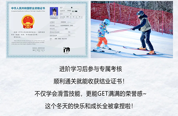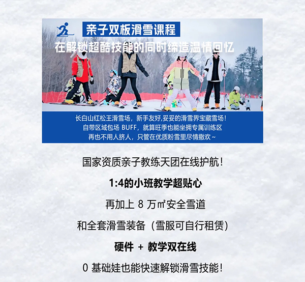 上午:出发前往滑雪场,车上调频FM66.6电台播报,分享滑雪小知识(车程20分钟),滑雪装备穿戴学习,区域包场训练、亲子滑雪技能GET,滑雪教练师资1:4
