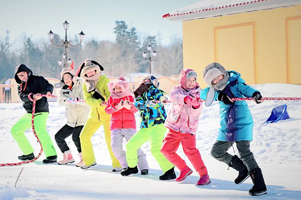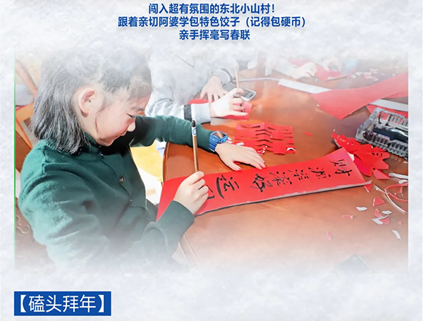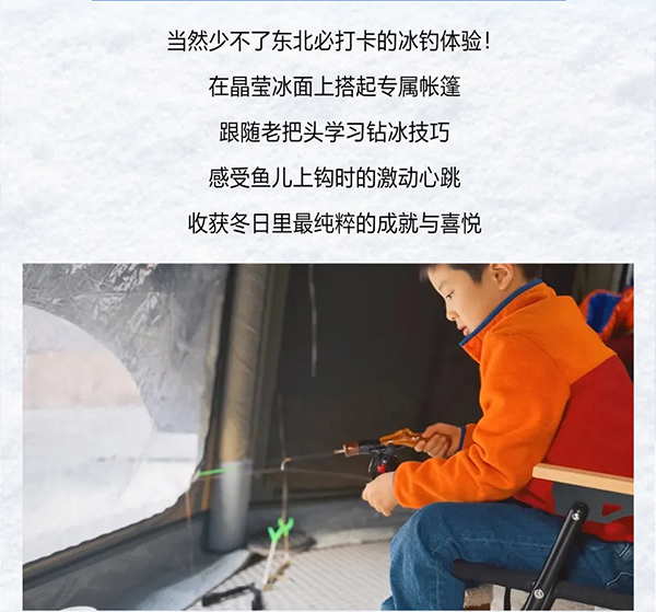 下午:专属村落体验东北过年文化;挖雪洞、摆糖果、打雪仗、上炕头了解东北过年习俗、亲子拉爬犁接力赛、雪地拔河、冰钓、雪地足球赛、包饺子、写春联、剪窗花、铁盆拜年领红包等