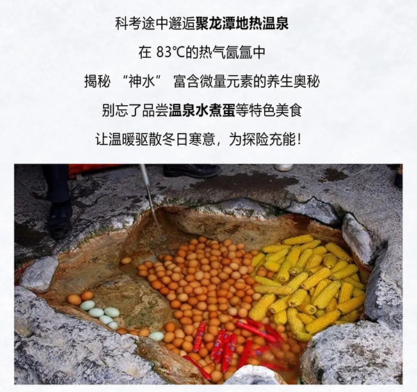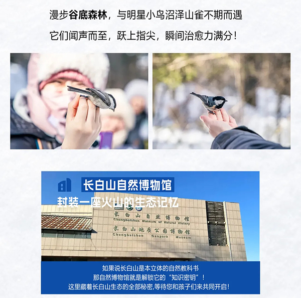 上午:登顶长白山,打卡天池,眺望中朝边境,长白瀑布、绿源潭、地下森林偶遇网红小鸟、品尝温泉蛋、聚龙温泉研学课