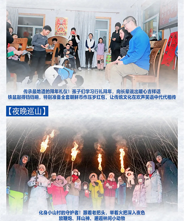 行程:赶长白山东北大集——中科院生态系统定位站——挖雪洞等民俗活动——夜巡森林——放烟花——东方大型村晚