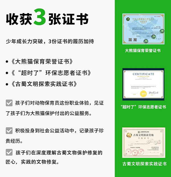【国宝守护——化身小小“保育员”】从大熊猫的行为习性观察到深入大熊猫国家保护区,并做一名合格的国宝“铲屎官”,走进基地非游客区域进行义工体验。帮大熊猫搬运竹子、在饲养员带领下观看饲养员喂食熊猫、行为观察分析、“制作窝窝头”等等,争取当个被大熊猫认可的一日“保育员”