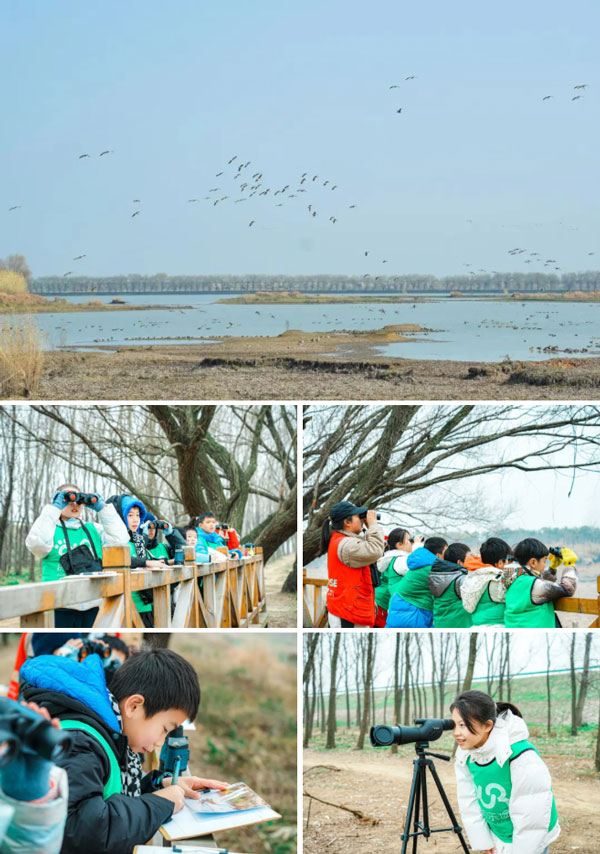 前往府河湿地,在专业老师的带领下观察候鸟:东方白鹳、白尾海雕、小天鹅、卷羽鹈鹕、白琵鹭、白尾鹞等约20种国家重点保护鸟类,感受武汉这一道独特的景观。