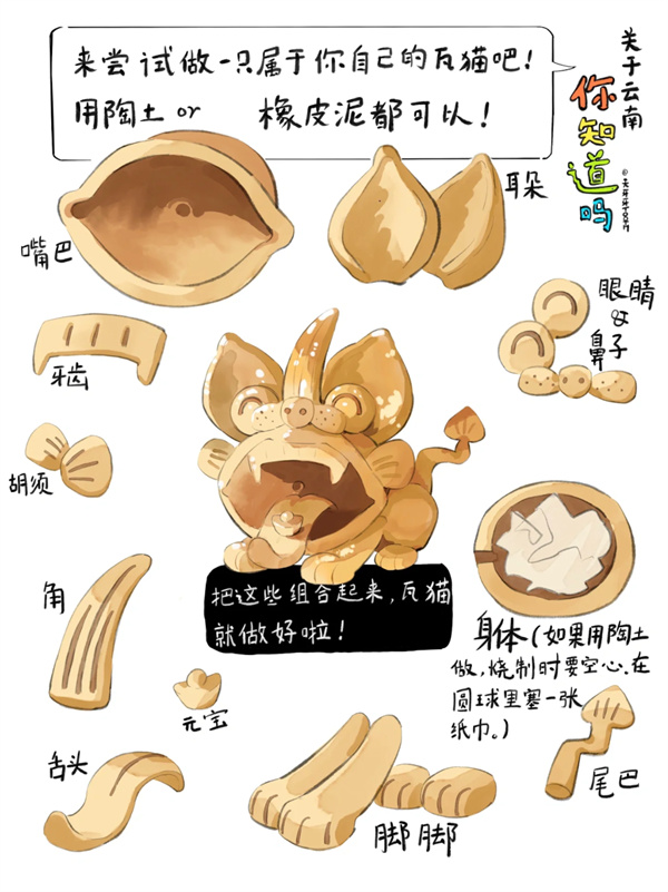 瓦猫是云南传统民居中常见的装饰物,具有驱邪纳福的寓意。在非遗传承人的指导下,了解瓦猫的造型特点、文化寓意,孩子们和家长共同动手,充分发挥自己的想象力和创造力,亲手用陶土塑造出属于自己的瓦猫形象。