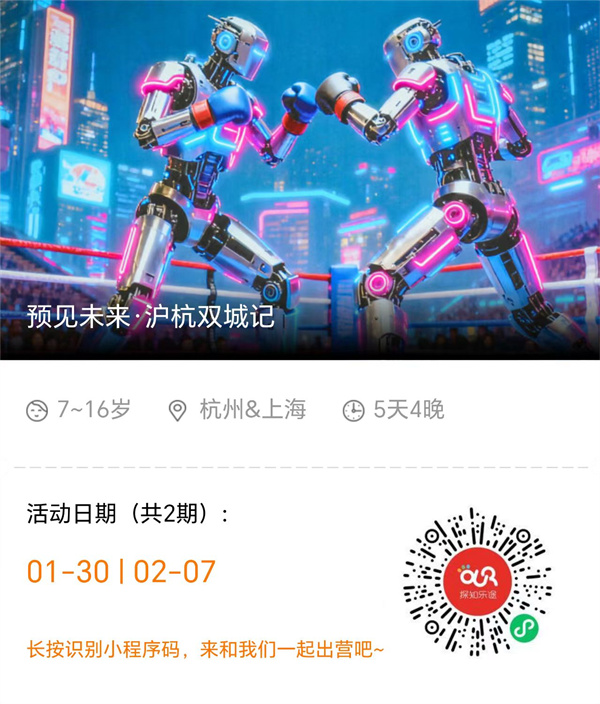 当AI科技席卷而来,我们尚且又了解多少?未来孩子又应该具备哪些核心能力?这一次我们在杭州以“数字人文创新”与“硬核科技实践”为引擎,在上海以“创造乐园”与“都市探索”为窗口,让孩子在科创体验与梦想实践中感受中国力量,共同在这场科技的游学中看见未来,成为未来~
