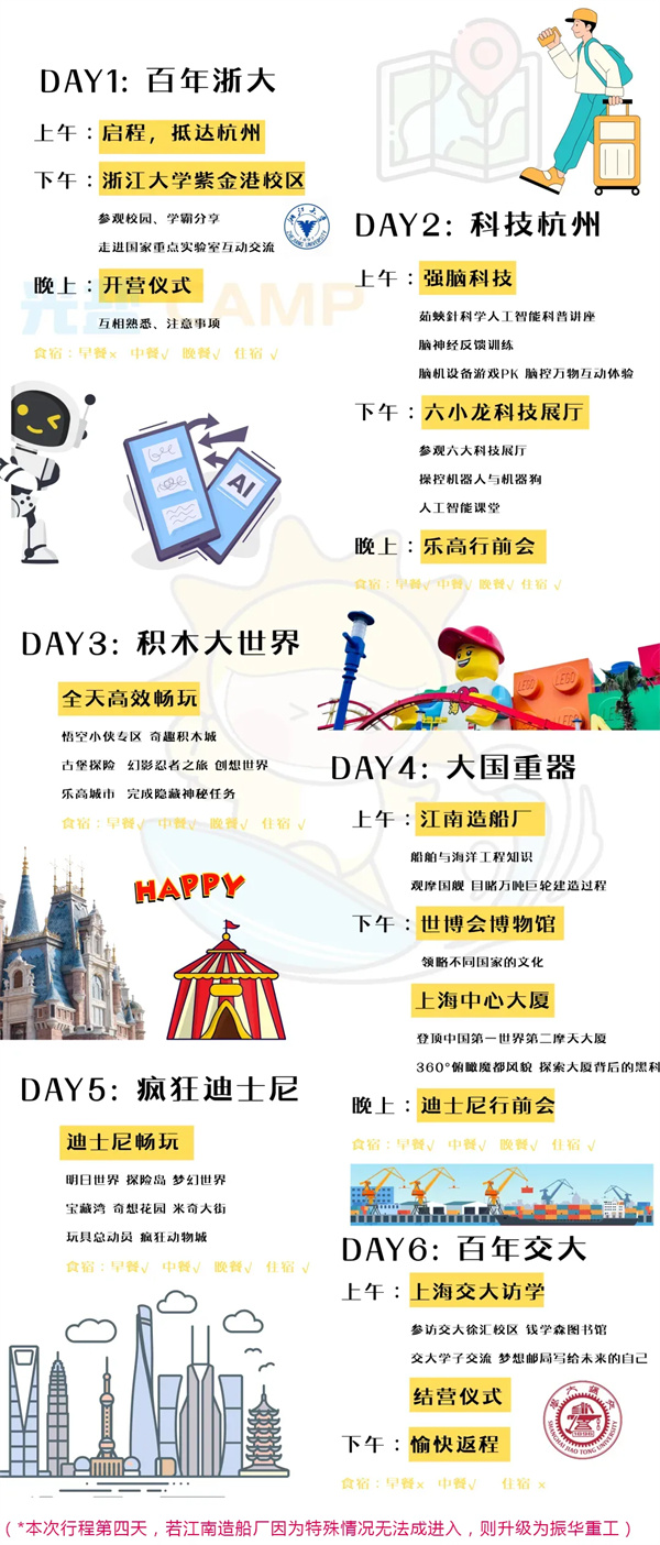 从上海乐高乐园的创意积木世界,到迪士尼的奇幻童话王国,从江南造船厂的万吨巨轮建造现场,到上海中心大厦的都市之巅,再到世博会博物馆的全球文化与交大校园的学术传承,我们希望用这场双城之旅,让孩子们在科技与梦想的交织中收获成长,启迪未来。